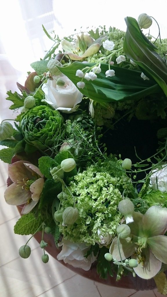 スズランをメインに白とグリーンのお花でテーブルリースのアレンジメント作ります。