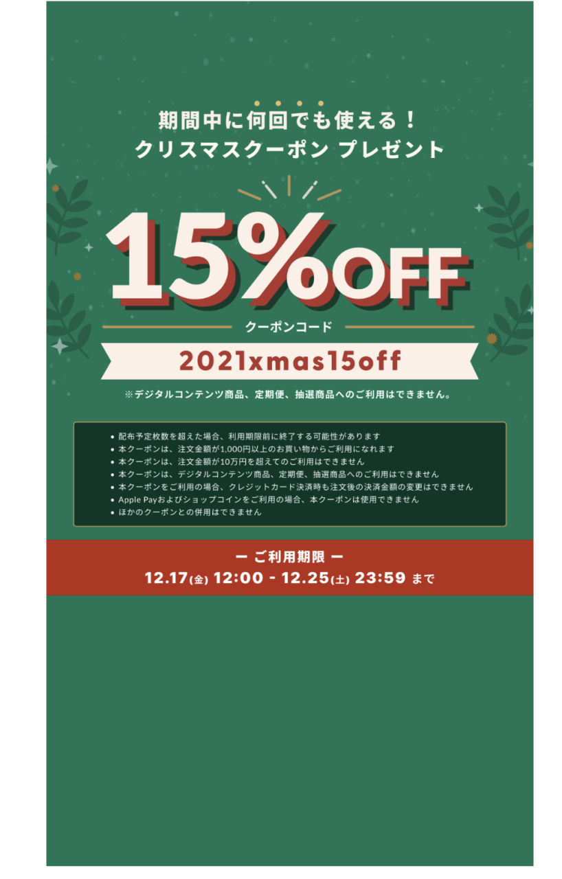 2021/12/19 クリスマスクーポンキャンペーン 【12/17~12/25 期間限定】 クリスマスクーポンキャンペーンを実施。 お得な15%OFFクーポンをGET♪ 商品購入画面で、クーポンコード≪2021xmas15off≫を入力して下さい。 全商品対象てすのです。 このアレンジメントをお正月風になどのご希望もお受けたします。 この機会にぜひお買い物でご活用ください!